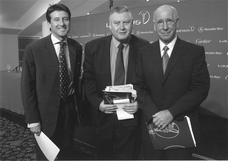 Tony stands between two sporting icons, Seb Coe and Bobby Charlton |